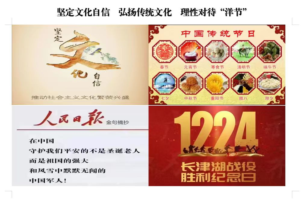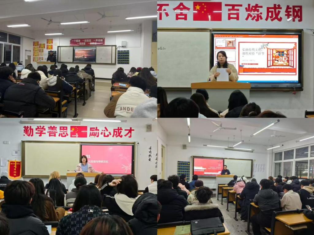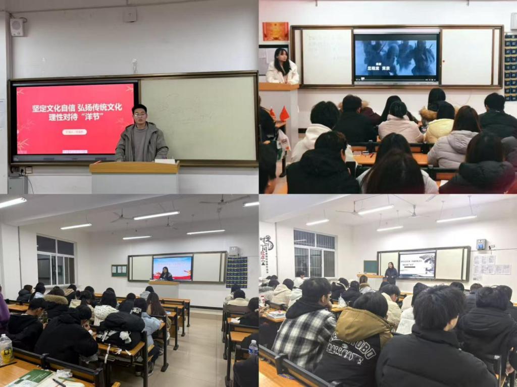 为进一步引导青年学子厚植家国情怀,筑牢民族文化根基,树立正确的文化认知导向。12月21日晚,太阳成集团tyc539组织各班级召开“坚定文化自信 弘扬传统文化 理性对待‘洋节’”主题班会。各班积极响应,结合班级特色策划开展了形式多样的活动,或分享传统节日典故,或组织传统习俗体验,让同学们在互动中加深 对中华传统文化的理解与认同。