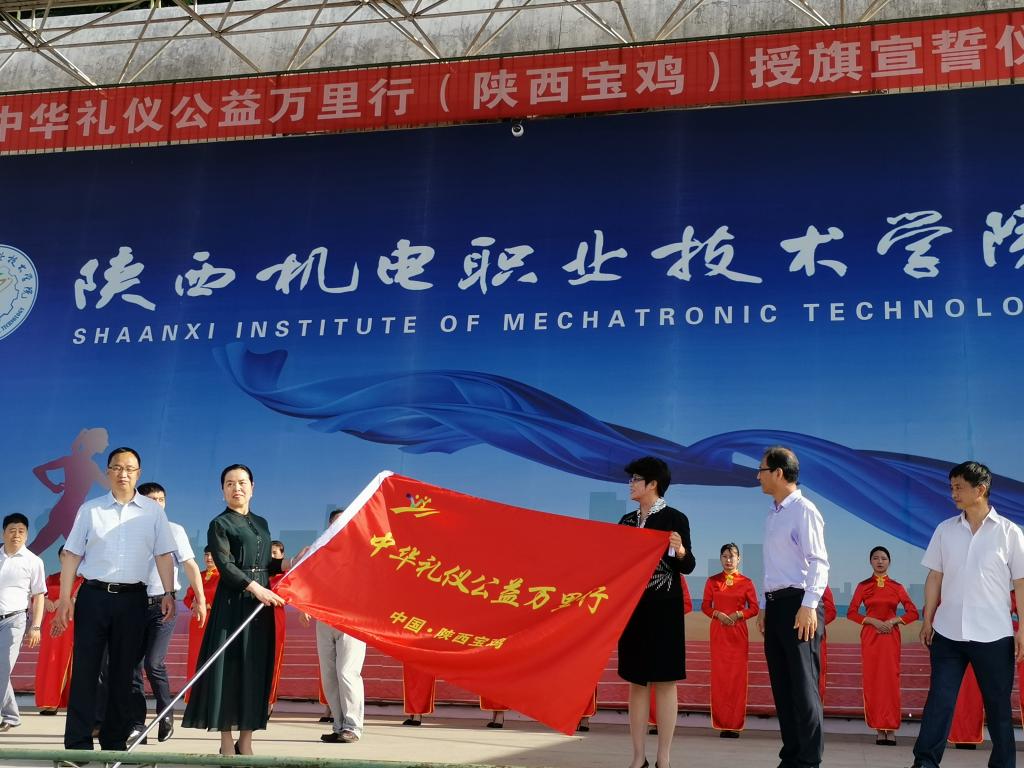启动仪式会场宏大,气氛热烈。在庄严隆重的仪式上,专业主持显示极高礼仪素质,也精准地阐释了中华礼仪万里行教育的重大意义。蔡少惠副会长宣读了《中华礼仪公益万里行倡议书》并为“弘扬中华礼仪公益万里行活动”陕西宝鸡站授旗,邢平礼仪工作室负责人、经济管理与艺术系党支部书记、系主任邢平代表宝鸡站接旗。