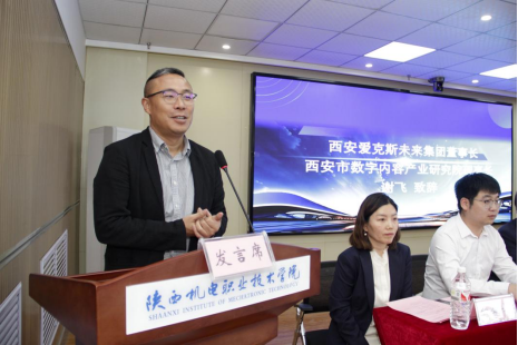 西安爱克斯未来集团董事长谢飞在致辞中介绍了西安市未来数字内容产业研究院,表示了当前产业人才需求的短缺,并明确了与公司在人才培养、专业建设、技术服务、创新创业等领域的深度合作,推动“人才共育、成果共享”。