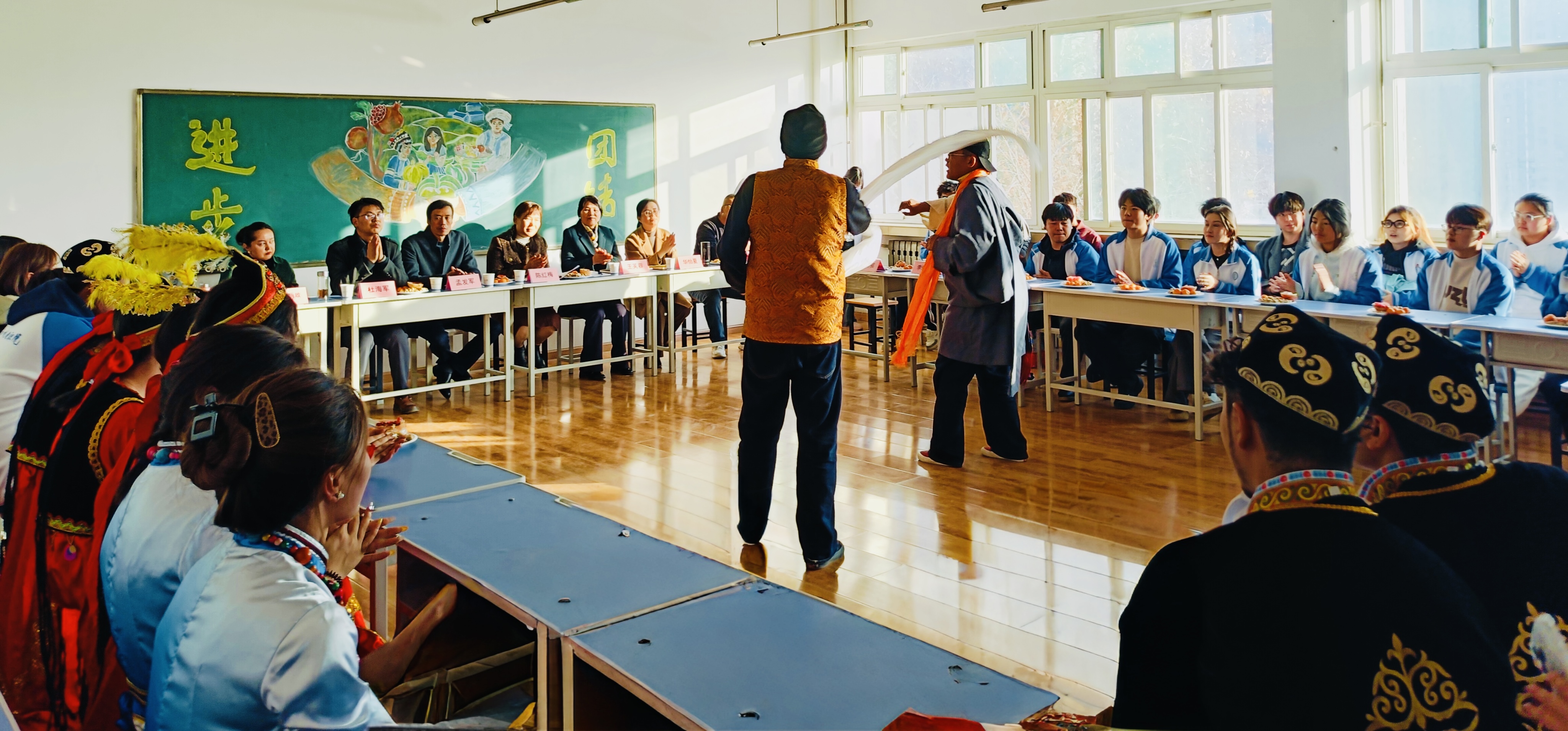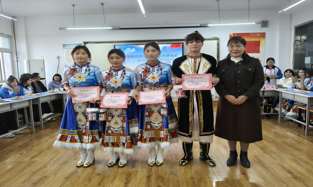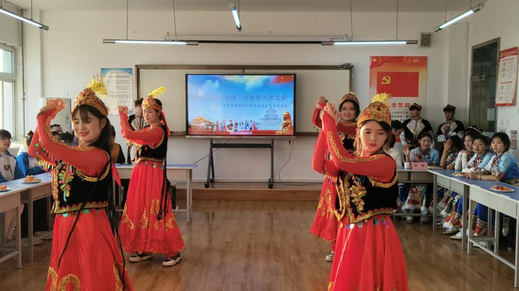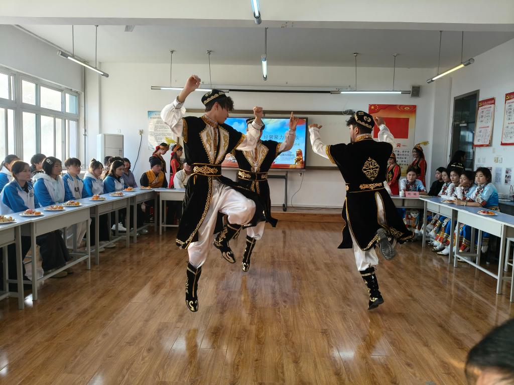 紧接着,同学们带来了民族特色文化展演。庄重舒展的舞蹈表演、深情豪迈歌曲演唱,赢得了在场师生的阵阵掌声。