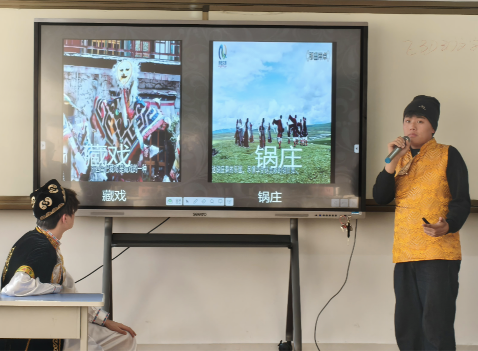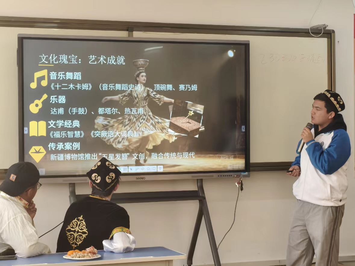 随后,来自不同民族的同学们带来了精彩纷呈的文化展示。25数字媒体1班的周毛措同学通过PPT生动介绍了青海的民族风情;25会计2班的藏扎和旦增加央同学分享了藏族文化的深厚底蕴;艾力凯木江同学则展示了维吾尔族丰富多彩的民族文化。