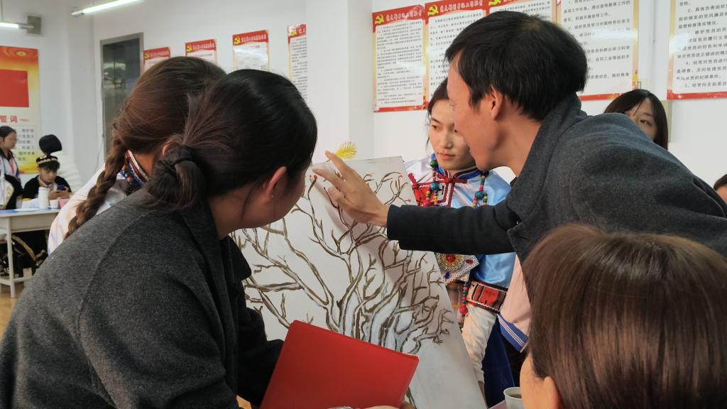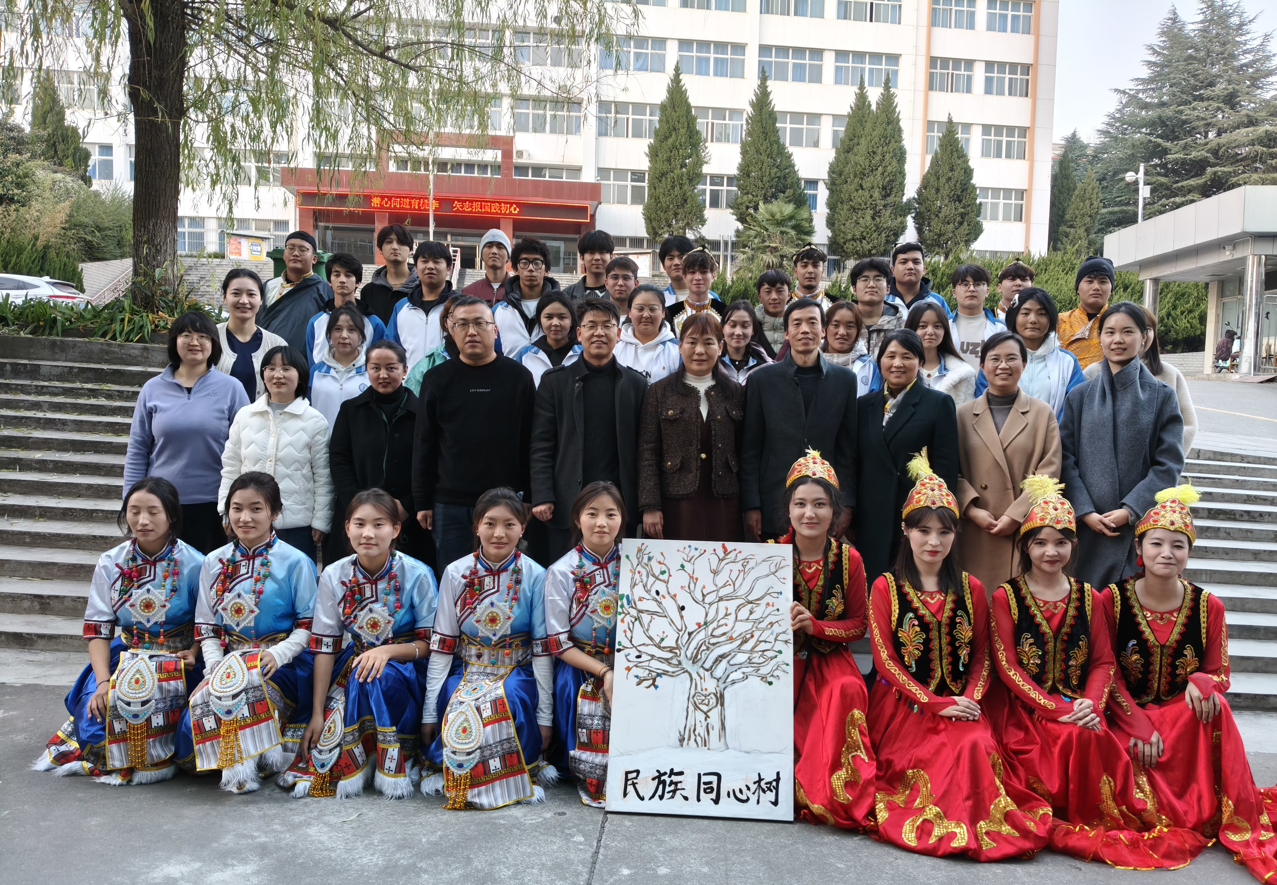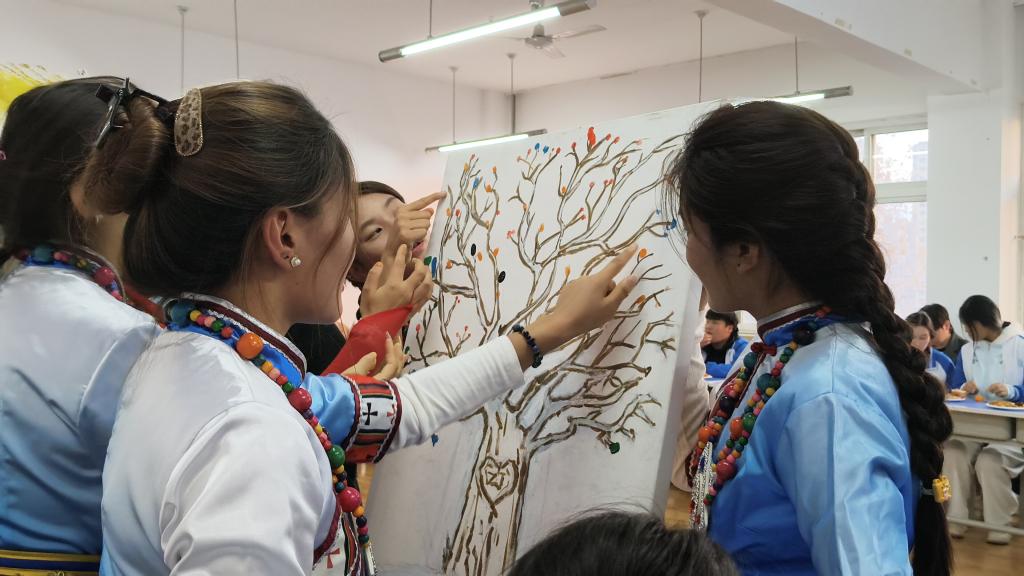 活动最后,与会师生共同参与了“共绘民族同心树”环节。大家依次用彩色手印在画布上印下一颗颗象征民族团结的“石榴籽”,共同绘就了一棵枝繁叶茂的“民族团结树”,寓意各民族像石榴籽一样紧紧抱在一起。