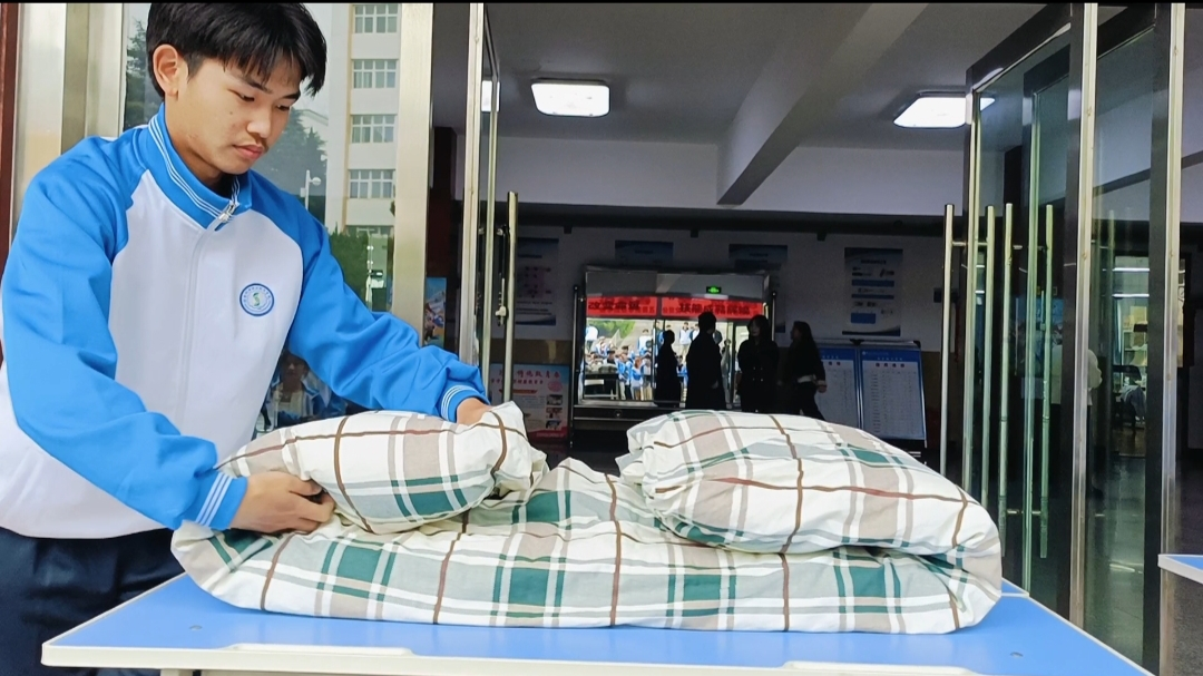 聘书发放完毕后,现场进行宿舍内务整理演示。员工代表熟练地进行叠被子内务操作。通过现场演示,让同学们更加直观地了解了内务整理的标准与技巧,为后续宿舍内务评比活动的开展奠定了良好基础。