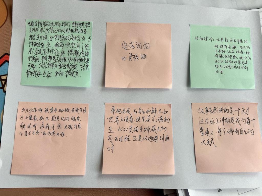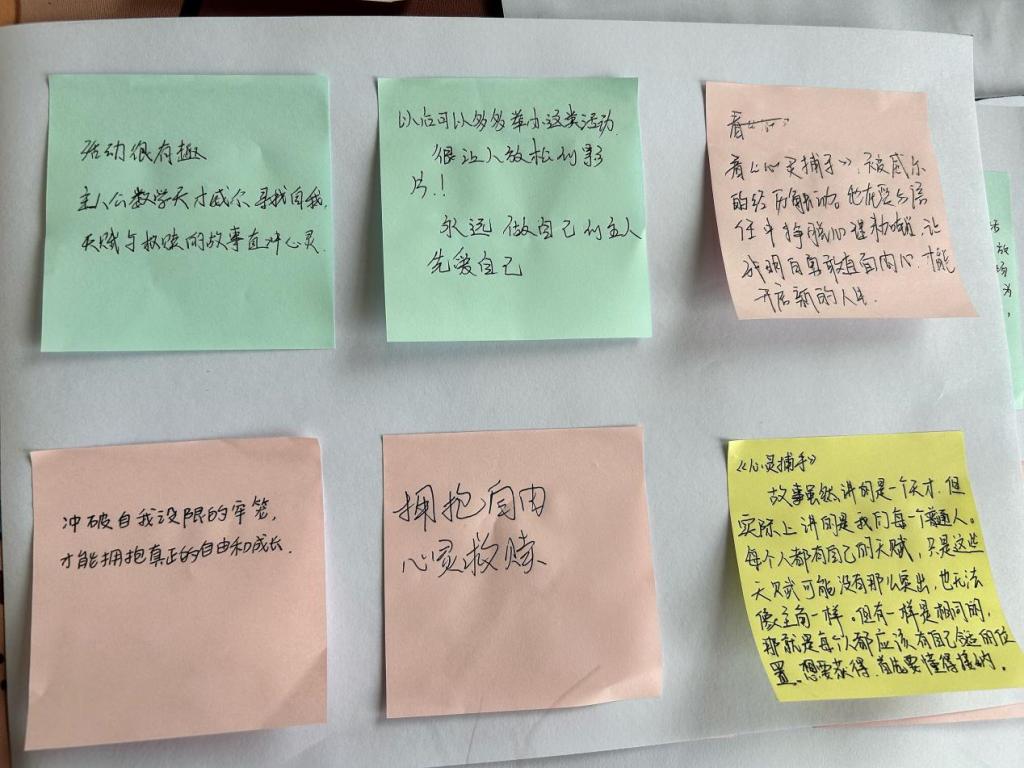 观影结束后,活动进入分组讨论环节。同学们围绕影片内容与匠心精神的关联展开热烈交流,各抒己见,“影片中主人公对知识的专注与探索,正是匠心精神在学习领域的体现。” 一位同学的发言引发了大家的共鸣。随后,每组选派代表进行观点分享,同学们从不同角度阐述对匠心精神的理解,有的结合专业学习,有的联系未来职业规划,现场思想碰撞激烈,精彩观点频出,最后,同学们有感而发,在一张张便签纸上留下本次观影现场感受。