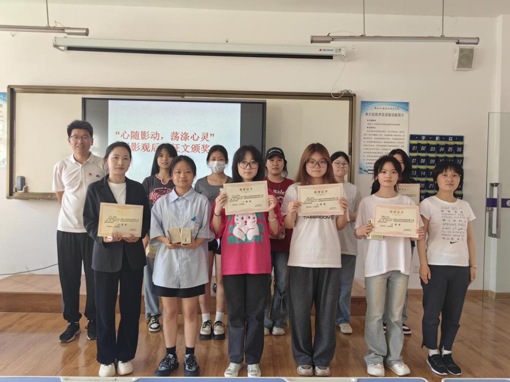 5月21日下午,员工工作办公室主任郭世强老师、专职辅导员何睦老师为获奖同学颁奖。颁奖仪式上,郭世强对获奖选手表示了热烈祝贺,并对他们的作品给予了高度评价,他表示,这些优秀的观后感不仅展现了同学们对电影的热爱,也体现了他们对生活的深刻思考和感悟。希望同学们再接再厉,不断提升自我。