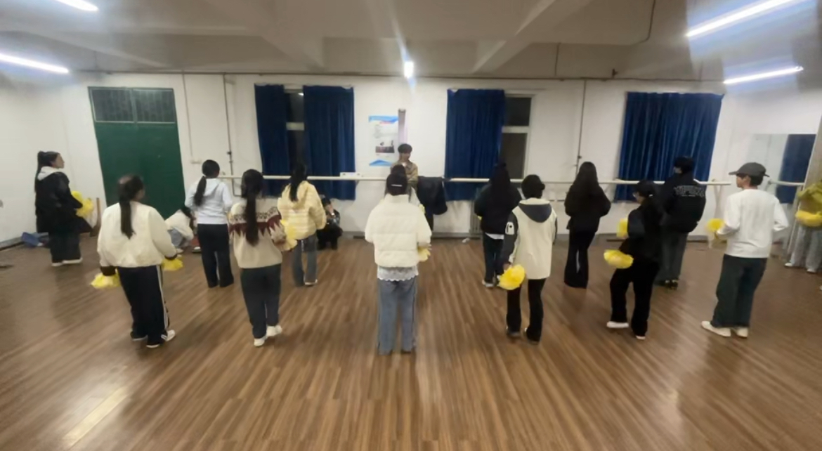 比赛前一日,团队提前抵达赛道表演区域开展彩排工作。针对户外场地回声、人流干扰等潜在问题,队员们在李铭萱老师指导下调整站位、预设备选动作,反复确认音乐音量、互动距离等细节。通过多轮完整彩排,团队进一步优化表演流程,确保在正式赛事中展现出了最佳状态。